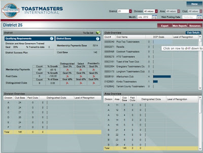 Tip: If you get a Runtime Error, close the box and click the District button to go back. The Export function does not always work; come back later and try again. - The More Reports button connects to the daily reports — Dues Renewal Status, Officer List Status, Educational Achievements, etc. These are the same as before and Silverlight is not needed to see them. Direct link: http://reports.toastmasters.org/reports/reports.cfm?d=25