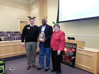 | Karl Bradley received his award at the Dec 8 TLI from two tiny reindeer; actually Dean Lampman and Bonne Stroman. |